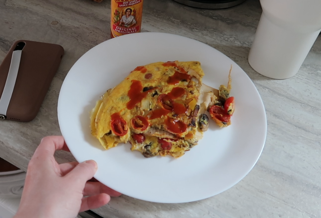 👉 Whisk 1 whole egg with 3 egg whites and set aside. In a pan fry up some veggies (I like onion, bell pepper, mushroom and baby tomatoes), then pour your eggs overtop. Add in some deli style turkey slices, flip in half to make an omelet and top with hot sauce.