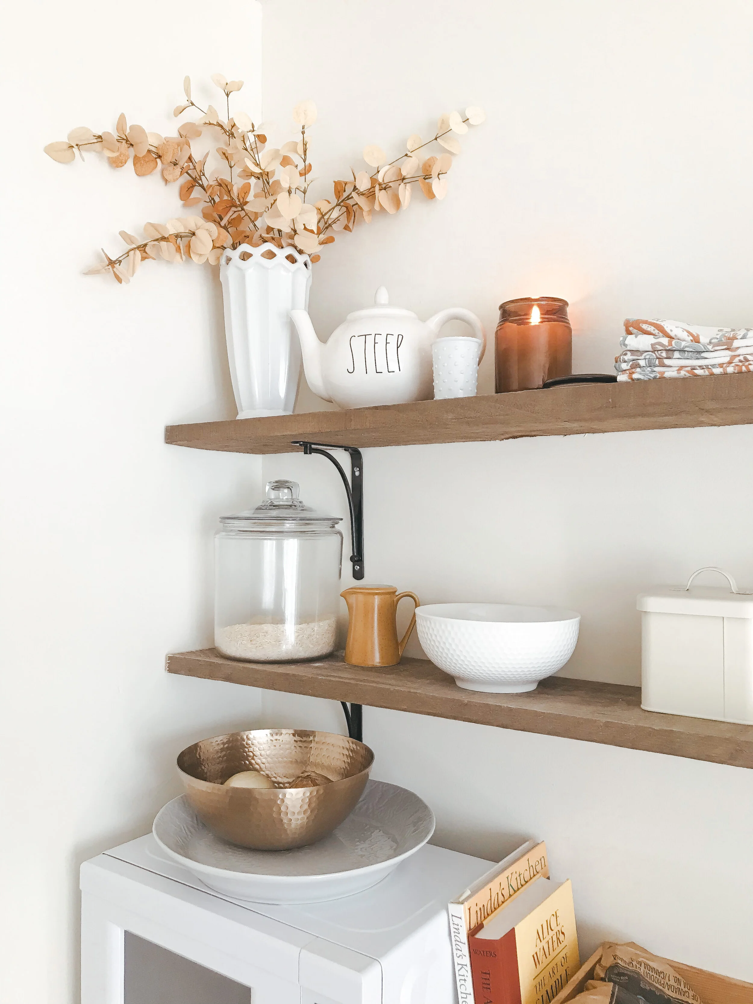 What I love most about this little fall decor refresh is that it cost zero dollars. I used only what I already had on hand from previous years, along with practical kitchen items that already fit into my mustard yellow, light blue, white and wood theme. The only other update I’ll likely make to this space is some fresh pumpkins and gourds once they become available at our local market!