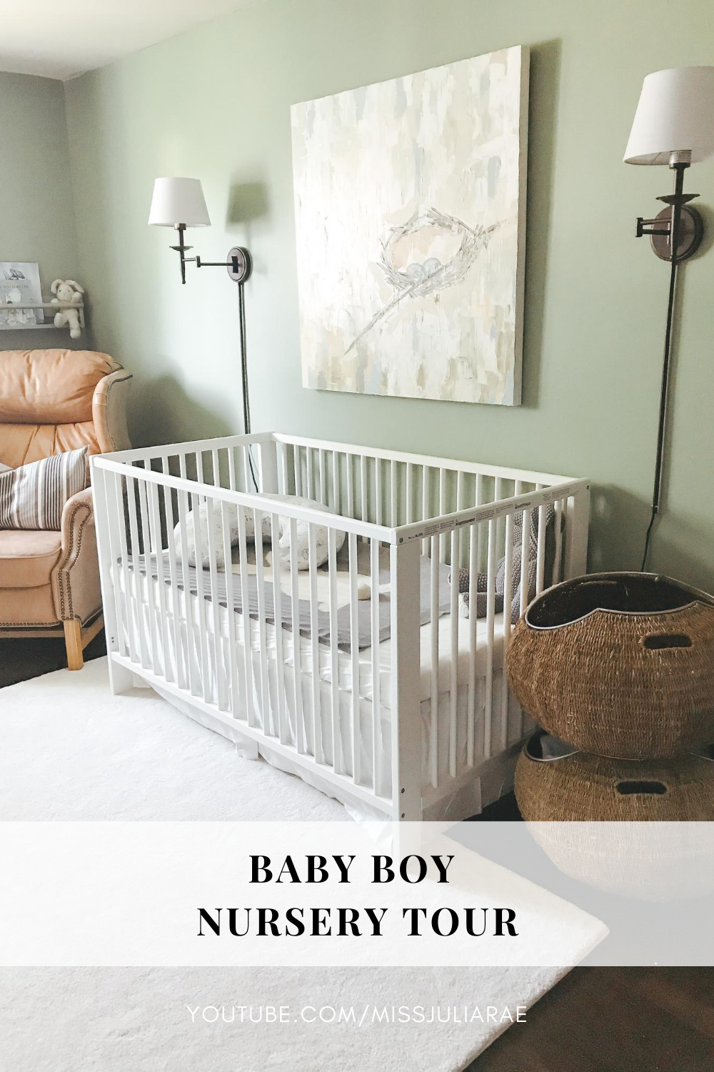 We are officially in our third trimester, and I am absolutely thrilled to be sharing a peek into our baby boy’s nursery decor. This project was loosely inspired by Erin Napier’s nursery for her daughter Helen - as soon as I saw that space pop up in my Pinterest feed I knew I wanted a green nursery. We ended up opting for a brighter green, and went with Clary Sage by Behr. It looks super soft in natural light all throughout the day, and slightly more vibrant at night in artificial light. The other inspiration I took directly from Erin’s nursery was for our lighting. I loved the idea of using sconces, and we ended up using these very affordable fixtures from Home Depot - just $30 each! We actually have the same sconces on either side of our bed in our master bedroom. Check out the video above for a full tour of the space as it is currently - we still have lots to do!